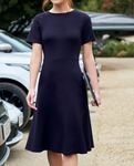 67% Viscose, 29% Polyamide, 4% Elastane. Short sleeve, fit and flare, 2 bust darts, waist seam detail, unlined, concealed zip.